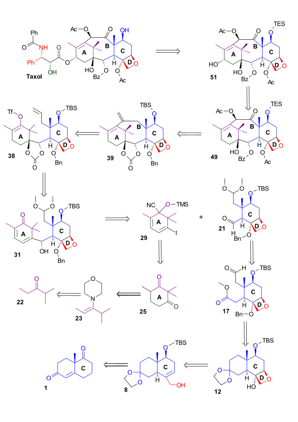 Taxol resulted from the tail addition of the Ojima lactam to alcohol 51, which is baccatin III (the original target molecule of the Danishefsky synthesis). Alcohol 51 was derived from the allylic oxidation of α-acylketone 49. Compound 49 was ultimately derived from the Heck reaction of enol triflate 38, which was used to close the B-ring. Enol triflate 38 resulted from a rearrangement of compound 31 after protection of its hydroxyl group. Compound 31 was derived from the connection of the A and C rings with aldehyde 21 combining with the vinyllithium reagent derived from cyanohydrin 29. Cyanohydrin 29 originated as the ethyl isopropyl ketone (22). Aldehyde 21 was obtained from compound 17, which was the product of the opening of ketal 12. Ketal 12 was ultimately derived from the Wieland-Miescher ketone (1).