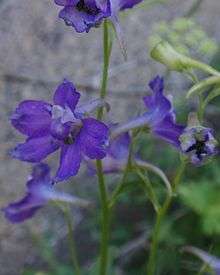 Delphinium polycladon is a species of larkspur known by the common name mountain marsh larkspur. It is native to the High Sierra Nevada and the White and Inyo Mountains of eastern California and far western Nevada, where it grows in wet sites in the talus. It is a perennial herb producing one or more erect stems which easily exceed a meter in height but often remain dwarfed in high-elevation, exposed habitat with thin soils.[1] The leaves are small and mostly located near the base of the plant. The inflorescence is a raceme of up to 35 flowers on long, S-shaped pedicels, often arranged along one side of the stem. The sepals are deep blue to purple, one to two centimeters long, and with a spur up to 2 centimeters in length.