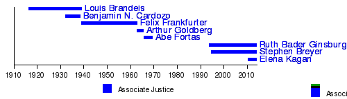 The demographics of the Supreme Court of the United States encompass the gender, ethnicity, and religious, geographic, and economic backgrounds of the 112 people who have been appointed as justices to the Supreme Court. Certain of these characteristics have been raised as an issue since the Court was established in 1789. For its first 180 years, justices were almost always white male Protestants.[1] Prior to the 20th century, a few Roman Catholics were appointed, but concerns about diversity of the Court were mainly in terms of geographic diversity, to represent all geographic regions of the country, as opposed to ethnic, religious, or gender diversity.[2] The 20th century saw the first appointment of a Jewish justice (Louis Brandeis, 1916), an African-American (Thurgood Marshall, 1967), an Italian-American (Antonin Scalia, 1986), and a woman (Sandra Day O'Connor, 1981). The 21st century saw the first appointment of a Hispanic justice (Sonia Sotomayor, 2009) if Benjamin Cardozo, 1932, is excluded (see the discussion below).