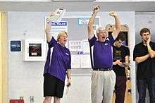 In his first year at Ferndale High School in 1967, Denny Hill won 3 meets, which he attributed to most of the senior quitting since he had been their 3rd coach and was requiring them to come to practice.[5] During his tenure as coach at Pioneer High School, the men's and women's swim teams won 31 Michigan High School State Swim Championships (15 for the men's team and 16 for the women's team).[7] After getting married in 1983, Denny and Liz Hill became a coaching team. Liz was named assistant coach of both the men's and women's teams beginning in 1984 but became co-head coach of both teams in 2005. Between 1969 and 2014, the Pioneer Men's Swim & Dive Team won the Michigan High School State Championship in the following years: 1977, 1978, 1979, 1980, 1981, 1982, 1984, 1985, 1993, 1999, 2002, 2003, 2005, 2006, and 2009. In only 6 of those 45 years did the men's team place lower than 4th place in the state championships. Between 1973 and 2010, the Pioneer Women's Swim and Dive Team won the Michigan High School State Championship in the following years: 1979, 1985, 1987, 1989, 1990, 1991, 1992, 2000, 2001, 2002, 2003, 2004, 2005, 2006, 2007, and 2008. During these time periods, the men's and women's teams won 9 National Dual Meet (Power Points) Championships (the women's team also won 3 Mythical National Championships from Swimming World). Over the course of Denny's career at Pioneer High School, the combined dual meet record was 1011-128-2 (567-90 for the men and 444-38-2 for the women.[1] The swim program produced 245 National Interscholastic Swim Coaches Association (NISCA) All-American Swimmers (140 men and 105 women) for a total of 862 All-American awards. These swimmers included Olympians Kara Lynn Joyce and Alison Gregorka. At Pioneer High School, Joyce set 4 national high school records in the 50 yard freestyle, 100 yard freestyle, 200 yard freestyle relay, and 400 yard freestyle relay before going on to swim at the University of Georgia.[8] Joyce has 4 Olympic silver metals.[9] Gregorka played water polo for Stanford University,[10] and was a member of the US water polo team that won a silver medal at the 2008 Beijing Olympics.[11] Denny also coached Dan Stephenson, who wrote The Underwater Window, a novel about competitive swimming.[12] Denny Hill was named Michigan Interscholastic Swim Coaches Association Coach of the Year 31 times, Michigan High School Coaches Association Hall of Fame Inductee in 2003, NISCA Outstanding Service Award recipient in 2005, NHSACA National Coach of the Year in 1999, and a NHSACA Hall of Fame Inductee in 2008.[13][14] In March 2014, Denny Hill was inducted into the NISCA Hall of Fame for swim coaches.[15] In November 2008, Pioneer High School rededicate their pool, "Hill Pool."[16] Denny was particularly honored that the pool naming was inclusive of both him and Liz.[16] Both Denny and Liz Hill retired from coaching the women's team in 2010 and the men's team in 2014.[7] In 2011, Eric Stanczyk took over as head coach of the Pioneer Women's Swim and Dive Team. Stanczyk swam at Eastern Michigan University and was the captain of the team in his senior year;[17] he also swam with the Hills' son, Steven, at EMU.[18] Following the Hills' retirement from the men's team in 2014, Stefanie (Liebner) Kerska took over as head coach of the Pioneer Men's Swim and Dive Team.[19] Kerska swam for the Hills at Pioneer High School, and then went on to be a 7-time Big Ten Champion and assistant coach at the University of Michigan.[20][21] While at the University of Michigan, Kerska was the first woman to be selected by CollegeSwimming.com as Assistant Coach-of-the-Year.[22] Kersak took over as head coach of the Pioneer High School Women's Swim and Dive Team in the fall of 2015.