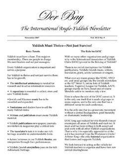 It was a 16-page monthly that was published 10 times a year with a suggested contribution of $18 a year. It was augmented by its website at www.derbay.org and was the organ of the International Association of Yiddish Clubs (IAYC). Regular monthly columns included: Der internatsyonaler kalendar, Oystsugen fun briv in der redaktsye, Der altveltlekher farband fun yidish-klubn nayes, monthly updates on the upcoming IAYC conference, original Chełm stories, stories about mama and poetry, articles and stories submitted by readers.
