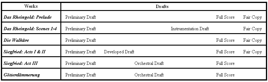 Like his libretti, Wagner's operatic scores generally passed through a series of distinct stages from sketch to fair copy; but because the composer altered his method of musical composition several times during the writing of the Ring, there is not the same uniformity in the evolution of the music that we find in the texts. Furthermore, it was often Wagner's practice to work on two or more drafts of a work at the same time, switching back and forth between them as the fancy took him. Consequently, it is all but impossible to make definitive statements about the exact order in which the various themes, leitmotifs and instrumentations were arrived at. Each score, however, did pass through at least three stages, there being seven possible stages in all:[1]