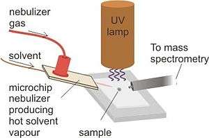 Desorption of the sample is initiated by a hot jet of solvent vapor that is targeted onto the sample by a nebulizer microchip. The microchip is heated in order to vaporize the entering solvent and create dopant molecules in order to thermally desorb the sample surface.