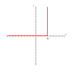 When forward biased, the ideal diode is simply a short circuit and when reverse biased, an open circuit. If the anode of the diode is connected to 0 V, the voltage at the cathode will be at Vt and so the potential at the cathode will be greater than the potential at the anode and the diode will be reverse biased. In order to get the diode to conduct, the voltage at the anode will need to be taken to Vt. This circuit approximates the cut-in voltage present in real diodes. The combined I-V characteristic of this circuit is shown below: