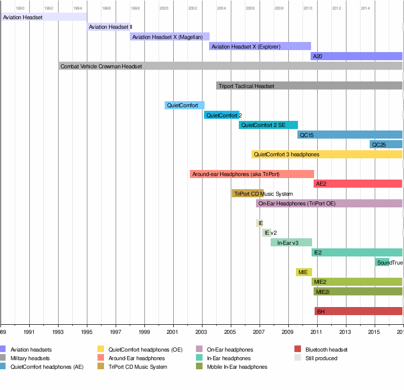 The Bose QuietComfort Headphones (also now known as the QC1) was the very first consumer level headphones released by the company in 2000.[2]