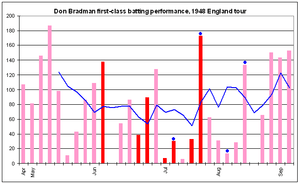 Bradman ended the first-class matches atop the batting aggregates and averages, with 2428 runs at 89.92, and eleven centuries, the most by any player.[2] The next most prolific scorer was Morris with 1922 runs, and Hassett had the next best average with 74.42.[2] His highest score of the tour was 187 against Essex, and he reached 150 on four occasions.[1] Despite his success, he also gained attention for his troubles against Alec Bedser's leg trap; Bradman was dismissed three consecutive times in the Tests in this manner, and twice outside the Tests to other bowlers using the same ploy.[66][106] Robertson-Glasgow said "at last his batting showed human fallibility. Often, especially at the start of the innings, he played where the ball wasn't, and spectators rubbed their eyes".[178] In the Tests, Bradman finished with 508 runs at 72.57 and two centuries. Only Morris and Barnes averaged higher and only Morris and Denis Compton of England aggregated more.[179][180] Apart from the match against Leicestershire, when he batted at No. 4,[14] and the two non-first-class matches against Scotland,[155][156] Bradman always batted at No. 3.N-[1] He bowled only one over during the tour, against the Leveson-Gower's XI when the result of the match was beyond doubt.[1][153]