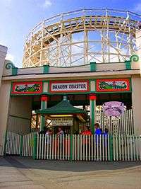 The Dragon Coaster, Playland Park's iconic attraction, in Rye, New York, is a wooden roller coaster that was opened in 1929. It was designed and built by legendary amusement ride creator Frederick Church,[1] who also was the co-inventor of the Racing Derby, another famous early 20th century amusement park ride. The Dragon Coaster has approximately 3,400 feet of track and is, at its highest, approximately 80 feet tall. It has a tunnel along its span, a common feature of wooden roller coasters from the 1920s, that resembles the body of a Dragon and the opening of the tunnel resembling the mouth of a Dragon. It has also been featured in the film Fatal Attraction,[2] Mariah Carey's music video Fantasy, and Big, starring Tom Hanks. The Dragon Coaster is still in operation to this day.