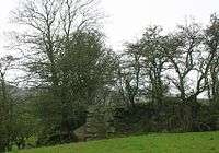Dundonald Woods (NS363343) are one of the most extensive areas of elm-dominated woodlands in Ayrshire. Ash, oak and sycamore are also abundant; much of the policies are composed of derelict-coppiced-type growth from trees felled in the Second World War. Some conifer plantations are present. Wetland habitats are also present, including the Collennan Reservoir, springs and a eutrophic loch, contributing to the high biodiversity of the site. Dog's Mercury, Wood Melick, Broad-leaved Helleborine, and Giant Bellflower are amongst the significant plants present.[7]