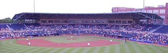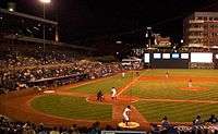 Durham Bulls Athletic Park (DBAP, pronounced "d-bap") is a ballpark in Durham, North Carolina that is home to the Durham Bulls, the AAA affiliate of the Tampa Bay Rays of Major League Baseball. It is also home to the Duke Blue Devils[8] and North Carolina Central Eagles college baseball teams.[9] The 10,000-seat park was opened in 1995 and is a $18.5-million brick ballpark.