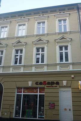 This corner house has been commissionned by Mr Jäfel, a lithograph.[21] In 1908, a drugstore run by Dr Aurel Kratz opened there: he was also selling goods for cameras[22] until World War I. He then moved to Friedrichstraße.[23]