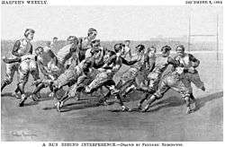 Despite their effectiveness, the flying wedge, "V-trick formation" and other tactics which involved interlocking interference, were outlawed in 1905 through the efforts of the rule committee led by Parke H. Davis, because of its contribution to serious injury.[29] Non-interlocking interference remains a basic element of modern American football, with many complex schemes being developed and implemented over the years, including zone blocking and pass blocking.