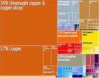 copper, 53.6% grapes and other produce, 8.4% chemicals, 5.0% fish and seafood, 4.5% paper and pulp, 3.3% wine, 2.4% lumber, 2.2% gold, 2.1% (2014)[11] |