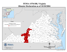 - ↑ Michael D. Brown (October 18, 2004). "Federal Register Notice: Major Disaster Declaration for the Commonwealth of Virginia". Federal Emergency Management Agency. Retrieved April 3, 2010.