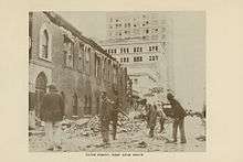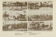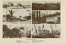 In Palm Beach, about fifty men shoveled sand off Ocean Boulevard and cut down damaged palm trees with crosscut saws.[127] On September 19, then-Mayor of West Palm Beach Vincent Oaksmith issued a "no work, no food" order, effectively stating that all able-boded men should work toward relief efforts.[77] The Delray Beach City Council issued a similar order.[128] Initially, rebuilding in West Palm Beach was slow. City Manager A. E. Parker issued a public notice that stated "Because of the grave emergency now existing and the great need for shelter, it has not been deemed wise to insist upon building permits for necessary repairs." Many severely damaged buildings were declared "public menaces" and condemned for demolition, effective on October 23. On September 20, the West Palm Beach City Commission held a special session that allowed the City Treasurer to authorize an in advance requisition payment of $50,000 to the Red Cross. Also on the agenda was an anti-price gauging measure, which would fine individuals up to $500 and imprison them for a maximum of 30 days if they sold items above the pre-September 16 price.[129]