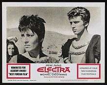 Electra (Greek: Ηλέκτρα Ilektra) is a 1962 Greek film based on the play, Electra, written by Euripides. It was directed by Michael Cacoyannis, as the first installment of his "Greek tragedy" trilogy, followed by The Trojan Women in 1971 and Iphigenia in 1977. It starred Irene Papas in the lead role as Elektra, and Yannis Fertis as Orestis.