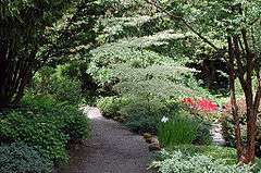 When Kerr died in 1957, his daughters, Anne McDonald and Jane Platt, gave the estate and an endowment for its maintenance to the Episcopal Bishop of Oregon on condition that the garden be open to visitors.[1] The diocese named the gardens "Elk Rock Gardens of the Bishop's Close".[4] The "Elk Rock" part of the name derived from the late 19th century name for nearby cliffs above the river.[1] The "Close" part of the name derived from a mainly British use of the word meaning "an enclosed area around a church or other sacred space".[4] The Elk Rock Garden Foundation and the Friends of Elk Rock Garden were formed in 1994 to protect and maintain the garden.[1]