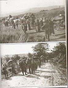 Greek schools are shut down and replaced by Bulgarian ones while the Greek language is banned in the churches and Holy Service is held only in Bulgarian, by Bulgarian priests.[19] However, the most inhumane measure is the so-called "hostageship", the displacement of Greek civilians aged 17–60 years to different regions of Bulgaria and the present-day Republic of Macedonia (which was then also under Bulgarian occupation), where they are forced to perform hard labour and die by the thousands, due to the unacceptable living conditions, malnutrition, exhaustion, diseases etc. A committee of the American Red Army that came in Eastern Macedonia to provide humanitarian aid when the war ended, estimated that the total number of displaced to Bulgaria (and other Bulgarian-occupied areas) Greek civilians from Eastern Macedonia and Western Thrace during the Bulgarian occupation of these areas during World War I was nearly 200,000, of whom around 60,000 died and never came back, while many of those who returned were in such wretched health condition that had become incapable of any work.[20][21][22][23][24][25]