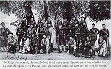 On June 13, 1905, a Greek band consisting of 8 men was arrested by an Ottoman detachment, along with 9 Gras rifles and 400 cartridges, according to a telegram of the British consul of Serres Ioannis Theodoridis to the British General Consul of Salonica Robert Graves.[15] According to narrations of elderly inhabitants, some days before their arrest the guerrillas were hiding in the nearby hill of Saint Demetrius, and their rifles were hidden in the belfry of the homonymous church. However, their presence was noticed by bypassing inhabitants of the neighbouring Bulgarian village Moukliani (Мъклен/Mklen in Bulgarian), 8 km to the north, on the slopes of Mount Menoikio, who denounced them to the Ottoman authorities. So, when the guerrillas went to the village for provisions they were suddenly surrounded by Ottoman soldiers. Whenever they went to the village, they were dressed in local costumes in order to avoid to arouse suspicions. However, their brand new costumes didn't seem to fit with their answer to the inquiries of the Ottoman soldiers that they were workers in a local tobacco warehouse. They were arrested and after cruel tortures revealed the truth.[16]