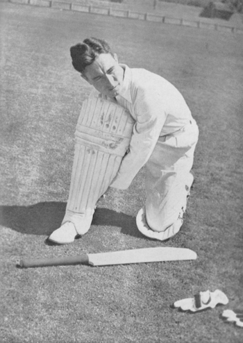 Walter Reginald Hammond – better known as Wally Hammond - had been a brilliant young batsmen, but in 1928–29 had forsaken the hook, the cut and the glance and played "through the V",[9] making a record 905 runs (113.12) by creaming the ball through the covers. "Striding down the pavilion steps at Lord's like a stately white galleon in full sail"[10] he would go to the middle where "he hammered the ball with imperious power...Hammond hardly seemed to give the bowler a chance, even though he attacked the bowling constantly"[11] Hammond was recognised as the greatest batsman in the world, is still regarded as one of the greatest players in cricket,[12] and was ranked 9 in ESPN's Legends of cricket. In 1932–33 he made 227 against New Zealand in the First Test after Herbert Sutcliffe and Eddie Paynter had been dismissed for ducks and 336 not out in the next with 34 fours and 10 sixes, the fastest triple century in Test cricket and his series average of 563.00 is unlikely to be exceeded. In 1937 he overtook Jack Hobbs' aggregate of 5,410 Test runs, and his final total of 7,249 runs (58.45) remained a record for 33 years until surpassed by Colin Cowdrey in the 1970s. On the tour he notched up his 167th and last first class century, his 36th first class double century (breaking Bradman's record) and became the seventh man to make 50,000 first class runs after W.G. Grace, Jack Hobbs, Phil Mead, Frank Woolley, Patsy Hendren and Herbert Sutcliffe.[13] As a slip fielder "he had no superior in the world", he was the first fielder to take 100 catches in Tests and his final tally of 110 was a record until Cowdrey beat it in 1968.[12] Hammond was also a Test class fast-medium swing bowler who batsmen compared to Maurice Tate, but he limited this bowling so he could concentrate on his batting.[14]