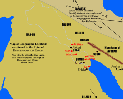 Enmerkar and the Lord of Aratta is a legendary Sumerian account, of preserved, early post-Sumerian copies, composed in the Neo-Sumerian period (ca. 21st century BC). It is one of a series of accounts describing the conflicts between Enmerkar, king of Unug-Kulaba (Uruk), and the unnamed king of Aratta (probably somewhere in modern Iran or Armenia).