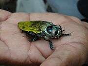 The body of E. gigantea is robust and elongated and the elytra have a wrinkled surface and a metallic green colour with reddish or purplish tinges. The pronotum has a dark spot on each side. [6][4] The larvae reach a length of about 12–15 centimetres (4.7–5.9 in).[6] The elytra of newly emerged adults have a coating of a yellowish, waxy powder. As the beetle ages this powder wear off. [4]