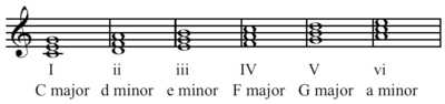The major scale contains seven basic chords, which are designated in harmonic analysis with Roman numerals in ascending order. Since the chord on the seventh scale degree is a diminished triad, it is not considered stable, and so only the other six chords may be treated at temporary tonic chords, and so be eligible for an applied dominant. In the key of C major, those six chords are: