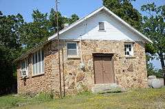 The Fairview School Building is a historic school building in rural Marion County, Arkansas. It is located on the north side of County Road 8064, just west of its junction with Arkansas Highway 178 and the Fairview fire department. It is a single-story stone structure with a gabled tin roof whose eaves have exposed rafter tails in the Craftsman style. Its walls are of both cut and uncut fieldstone, and the foundation is also stone. The main (south-facing) facade is symmetrical, with sash windows flanking a raised double door. The school was built in 1927 by local volunteer labor, despite a downturn in the area's population and economy.[2]