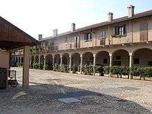 Isolated in the countryside (as Sant'Ambrogio, Guzzina and Occhiate) or unified in a rural agglomeration (as Cassina Baraggia and San Damiano), the farms were the core of peasant life. They had closed courts and shared architectural characteristics of farms on the plains north of Milan. In such designs the yard was intended to functionally link the property, having a central role in the agricultural chain of production (as occurred in Po-valley companies). Around the courtyard, usually very large, four buildings opened: two porches on the ground floor, topped by a railing leading to the residential upper floor; the third belonged to stables and barns; and the fourth was originally made up of small rooms used as latrines. The houses were so arranged: in the ground floor there were a kitchen, pantry, closets and the living room, bedrooms being upstairs. At the center of the courtyard one could find water well.[3][4]