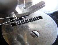 - ↑ Wilson received US patent 12116 on 19 December 1854 specifically for the four-motion feed; however, his machine that won US patent 9041 on 15 June 1852 was already using a moving feed dog whose tooth emerges from a slotted plate.