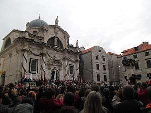 Festivity of Saint Blaise, the patron of Dubrovnik (Croatian: Festa Svetog Vlaha, zaštitnika Dubrovnika) is a festivity organised on February 3 continuously since year 972 in the City of Dubrovnik, Croatia on the occasion of the celebration of Saint Blaise's day. Festivity is based on the legend of the appearance of St. Blaise who helped the people of Dubrovnik to defend their town against Republic of Venice. Festivity is attended by a large number of people that include residents of the city, surrounding areas, other parts of Croatia and neighboring countries, as well as tourists, representatives of state and local authorities and Roman Catholic Church.[1] Festivity was made a part of UNESCO Intangible Cultural Heritage in 2009.[2]