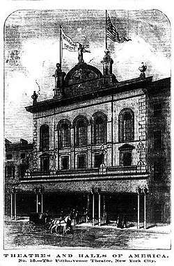 In 1877, a ventilation system was introduced at the theatre that blew air over blocks of ice, making it the world's first air-conditioned theatre.[6] John T. Ford managed the theatre for some years thereafter, naming it the Fifth Avenue Theatre. The theatre was destroyed by fire in 1891 and rebuilt by architect Francis Hatch Kimball in highly ornate neoclassical style, opening in May 1892.[7] The ornate entrance of the new structure faced Broadway for a time, but later the Fifth Avenue entrance was used as the main entrance. Henry Miner managed the theatre in the 1890s, and F. F. Proctor took control in 1900. He presented mainly vaudeville there and, by 1915, was showing motion pictures.[2] The theatre presented burlesque in the 1930s and, in its declining years, films. It was demolished in 1939.[3][8]