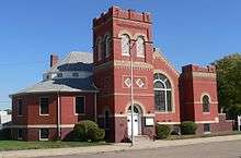 The Madison Presbyterian church is located on the southeast corner of Fourth and Nebraska Streets. Architecturally, its design has been described as "a modest Romanesque Revival style".[46] As a representative of this style, and because its interior serves as a well-preserved example of Akron plan design, the church was listed in the National Register of Historic Places in 2008.[47]