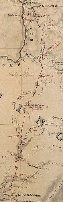 Various Indian tribes used the trail to travel to Kettle Falls for salmon and for trade between peoples.[8] David Thompson, fur trader, traveled the middle section of the road in 1811. In June 1811, after traveling down the Columbia River from the Kettle Falls area to Astoria in a canoe, he returned in August 1811 up the Columbia and Snake River to where the Palouse River joins the Snake River. This was an established camping place for the Nez Perce people, and later Lyons Ferry, and the Snake River Bridge. River levels were still very high and the currents fast, so they took the land route twenty-eight miles northeast through basalt formations and then forty miles through fine light loam with brooks and ponds, grass, and trees to Spokan House.[9] He also traveled the northern section of the road in June and then again in August 1811.[10] Soon after in 1812 or 1813, a fur trader competitor, Pacific Fur Company's Alexander Ross described travelling from Walla Walla to Colville crossing at the Palouse River and arriving at the Spokane River, where the Pacific Fur Company had a fur trading post called Fort Spokane, across from the North West Company's Spokan House.[11] A decade later in 1825, under Hudson Bay Company Governor George Simpson's orders, construction of Fort Colvile began and in April 1826, Spokan House was abandoned.[12]