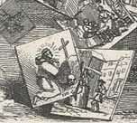 On one side of the road is a barber surgeon whose sign advertises Shaving, bleeding, and teeth drawn with a touch. Ecce signum! Inside the shop, the barber, who may be drunk,[32] haphazardly shaves a customer, holding his nose like that of a pig, while spots of blood darken the cloth under his chin. The surgeons and barbers had been a single profession since 1540 and would not finally separate until 1745, when the surgeons broke away to form the Company of Surgeons.[33] Bowls on the windowsill contain blood from the day's patients.