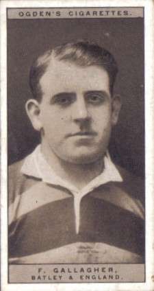 Frank Gallagher was an English professional rugby league footballer of the 1920s, playing at representative level for Great Britain, England, and Yorkshire, and at club level for Dewsbury, Batley, and Leeds, as a Stand-off/Five-eighth, Scrum-half/Halfback, Second-row, or Loose forward/Lock, i.e. number 6, 7, 11 or 12, or, 13, during the era of contested scrums.
