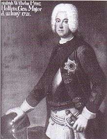 In 1733 Frederick William II was promoted to lieutenant general.[1] He participated in campaigns along the Rhine in 1734 and 1735 during the War of the Polish Succession. King Frederick II of Prussia was displeased with Frederick William after the Battle of Mollwitz during the First Silesian War in 1741. His regiment had been held in reserve and arrived on the battlefield too late to contribute to the battle. Unaware of the situation, he passed by several Austrian units. Nevertheless, King Frederick the Great was fond of the duke, whom he referred to as gute alte Holsteiner ("good old Holsteiner").[1] The duke was promoted to field marshal later that year and posted in Königsberg, the capital of East Prussia. He was also a recipient of the Order of the Black Eagle.[3]