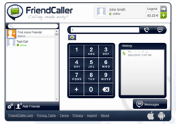 Calls to other FriendCaller users within FriendCaller are free of charge, while calls and SMS to phone numbers and mobile numbers within the PSTN network are charged via debit-based user account system. FriendCaller also became popular for its advanced mobile features like multi-point video conferencing with up to 7 participants who are displayed simultaneously in one live stream.[9] Unlike most VoIP service, FriendCaller operates in any desktop browser without prerequisite software installation[10] and works across Multi Operating System Platforms.[11] The browser-based capabilities are Java-based[12] and do not require Adobe Flash[13] and is hosted completely on Amazon's cloud.[14]