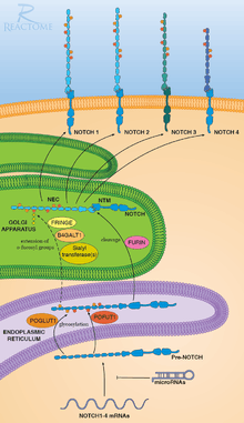 Pre-NOTCH proteins are translated and deposited in to the endoplasmic reticulum and are then first modifed by POFUT-1 then by PGLUT-1 then exported the Golgi apparatus. in the endoplasmic reticulum POFUT-1 utilizes its sub-strait GDP-β-L-fucose as a donor for the five carbon sugar Fucose. fucose is then attached to a serine amino acid residue. once Pre-notch is doned being modified by POFUT-1 and POFUT-2 it is then exported to the Golgi apparatus where it is futher modified and exported and Incorporated into the cell membrane.