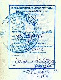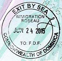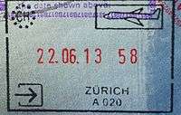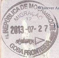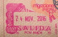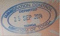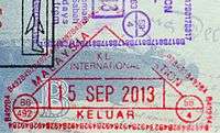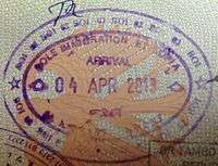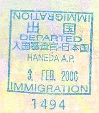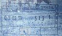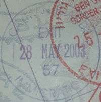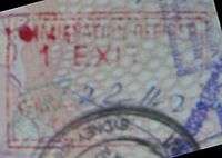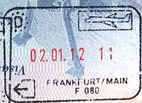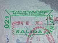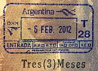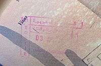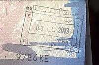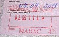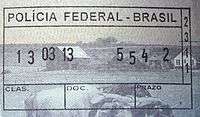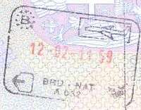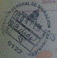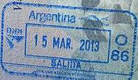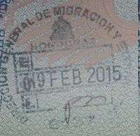 - ↑ Though stamps are issued upon both arrival and departure, there are only minor differences. The first 3 numbers after the date are assigned to the various points of entry and exit. The next number indicates entry or exit, '1' for entry, '2' for exit. The four digit number along the right edge is the Federal Police agent that made the stamp.