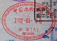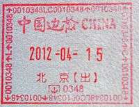 - ↑ As a special administrative region of the People's Republic of China, travelers entering Hong Kong will receive a different stamp than those entering mainland China. A Visa is issued to foreign passport holders only. An entry permit issued to mainland Chinese passport holders who apply in overseas or Macau but not in mainland China.