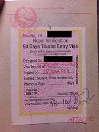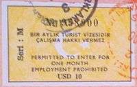- ↑ The visa stamps and top visa pictured are normally issued for business or official visitors only. Most tourists are issued a tourist card, pictured in blue, that is not contained within a passport and is surrendered upon departure.