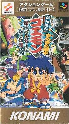 Ganbare Goemon Kirakira Dōchū: Boku ga Dancer ni Natta Wake (がんばれゴエモン きらきら道中~僕がダンサーになった理由~) is the fourth Ganbare Goemon game released for the Super Famicom on December 22, 1995.[2] This was one of the Super Famicom games that supports up to four players.