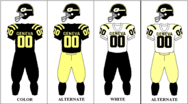 The Geneva Golden Tornadoes football program represents Geneva College in collegiate level football.[1] The team competes in NCAA Division III and is affiliated with the Presidents' Athletic Conference (PAC). The team is also a member of the National Christian College Athletic Association. Since its initial season in 1890, the team has won over 500 games. Home games are currently played at Reeves Field, in Beaver Falls, Pennsylvania. Several Geneva College players have received national attention, including Cal Hubbard and Larry Bruno.[2]