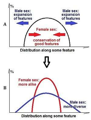 The first hypothesis analyses the sex differences of the shapes of phenotypic distributions. Since Darwin it has been noticed that within one species, and among related species, males often differ from each other to a higher degree than females,[11][12] creating a wider distribution of phenotypes. In other words, male phenotypes are more different from each other, and female phenotypes are more alike. A wider distribution of male phenotypes (high male variability) means an overrepresentation of males at the extremes of the phenotypic distribution, i.e. that there are more males on both tails of the distribution (for example with respect to intelligence, more mentally challenged and more geniuses) than females. In terms of heights, males show more extremes than women among the tallest and the shortest people on Earth. Such differences have been especially discussed in relation to human intelligence (see Variability hypothesis) but Geodakyan was focused on other sex differences in plants and animals The phenomenon of greater male variability was found in primates and humans with respect to physical characteristics [12][13] intelligence,[14][15][16] personality traits,[17] temperament traits,[18] in semantic perception,[19] physical aggression[20] and other psychological characteristics.[21] This phenomenon coincides with the common understanding that male sex (i.e. sex differentiation) emerged and was used by species in mostly variable environments.[22][23] Computer simulations indeed showed that variability and unpredictable behaviour by a part of a group optimize results for the whole group.[24]