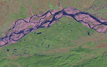 The southern border of the park is roughly defined by the Mora Diphlu river. Further south are the hills of Barail and the Mikir. The National Highway NH-37 was once the formal southern boundary of the park.[1] The Brahmaputra River constitutes the dynamically changing Northern boundary of the park. The other rivers in Kaziranga are Diphlu, Mora Diphlu and Mora Dhansiri.[3] Kaziranga is mostly flat expanses of fertile alluvial silt (part of the highly fertile Middle Brahmaputra alluvial flood plains),[1] exposed sandbars, riverine flood-formed lakes called Beels (Beels make up as much as 5% of the surface area)[1] and elevated flats called chapories where animals shelter during floods. Many artificial chapories have been built with the help of the Indian Army.[4][5] The average altitude of the park ranges from 4040 metres (131 ft) to 80 metres (262 ft),[1] with the Mikir Hills to the south of the park rising to around 1,220 metres (4,003 ft).[1]