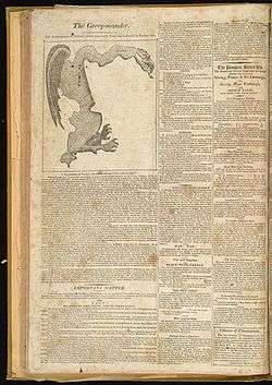 The coiner of the term "gerrymander" may never be firmly established. Historians widely believe that the Federalist newspaper editors Nathan Hale, and Benjamin and John Russell were the instigators, but the historical record does not have definitive evidence as to who created or uttered the word for the first time.[3] Appearing with the term, and helping to spread and sustain its popularity, was a political cartoon depicting a strange animal with claws, wings and a dragon-like head satirizing the map of the odd-shaped district. This cartoon was most likely drawn by Elkanah Tisdale, an early 19th-century painter, designer, and engraver who was living in Boston at the time.[3] The word gerrymander was reprinted numerous times in Federalist newspapers in Massachusetts, New England, and nationwide during the remainder of 1812.