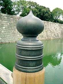 Giboshi (擬宝珠) is a kind of ornament used on older Japanese bridges.[1] In Japan, giboshi bridge ornaments in are said to resemble the bulbous flower of the onion. The ends of giboshi are bulbous and come to a point, resembling the onion domes in Western culture. They are often found in older Japanese bridges, and on bridges in Japanese gardens, temples and shinto shrines.