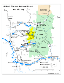 A 1993 Forest Service study estimated that the extent of old growth in the Forest was 198,000 acres (80,000 ha), some of which is contained within its wilderness areas.[14] The forest supervisor's office is located in Vancouver, Washington. There are local ranger district offices in Randle, Amboy, and Trout Lake.[15] The forest is named after the first chief of the United States Forest Service, Gifford Pinchot. Washington towns near entrances of the forest include Cougar, Randle, Packwood, Trout Lake and Carson.
