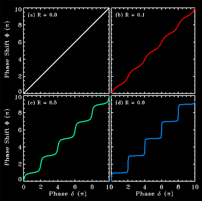 For R = 0, no reflection from the first surface and the resultant nonlinear phase shift is equal to the round-trip phase change () – linear response. However, as can be seen, when R is increased, the nonlinear phase shift gives the nonlinear response to and shows step-like behavior. Gires–Tournois etalon has applications for laser pulse compression and nonlinear Michelson interferometer.