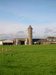 The farm was next sold in 1932 to Mr Sword, chairman of the Western SMT Company, who took considerable interest in the outbuildings and had the tower restored and the clock repaired. The two Italianate lodges, East and West, survive, together with part of the walled garden; the house itself was demolished in the 1940s. The farm steading is mainly original; a cottage is also present.[5] A Mr and Mrs Smith owned and worked the farm from around 1960.